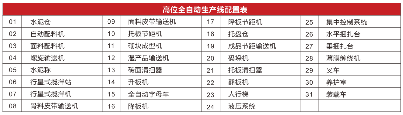 該全自動(dòng)砌塊生產(chǎn)線(xiàn)采用閉環(huán)生產(chǎn)流程設(shè)計(jì),由電腦、各種傳感器、機(jī)電液壓、機(jī)械組件組成,整個(gè)生產(chǎn)過(guò)程都是由 電腦控制,機(jī)械自動(dòng)化完成。包括:原材料的感測(cè)計(jì)量含水率、智能動(dòng)態(tài)調(diào)整攪拌水分比、濕料輸送成型生產(chǎn)控制、 濕產(chǎn)品輸送、電梯式立體升疊、子母擺渡車(chē)轉(zhuǎn)運(yùn)至養(yǎng)護(hù)窯養(yǎng)護(hù)、子母擺渡車(chē)自動(dòng)識(shí)別空窯和窯量、將未養(yǎng)護(hù)的濕產(chǎn)品 送入窯中養(yǎng)護(hù)、將已完成養(yǎng)護(hù)的干成品送至降板機(jī)、分層降送到干產(chǎn)品輸送機(jī)上、傳送到碼垛區(qū)、自動(dòng)碼垛抓手將養(yǎng) 護(hù)的干產(chǎn)品根據(jù)需要堆碼到托盤(pán)上約一個(gè)立方一跺、平板車(chē)輸送到自動(dòng)打包區(qū)等。